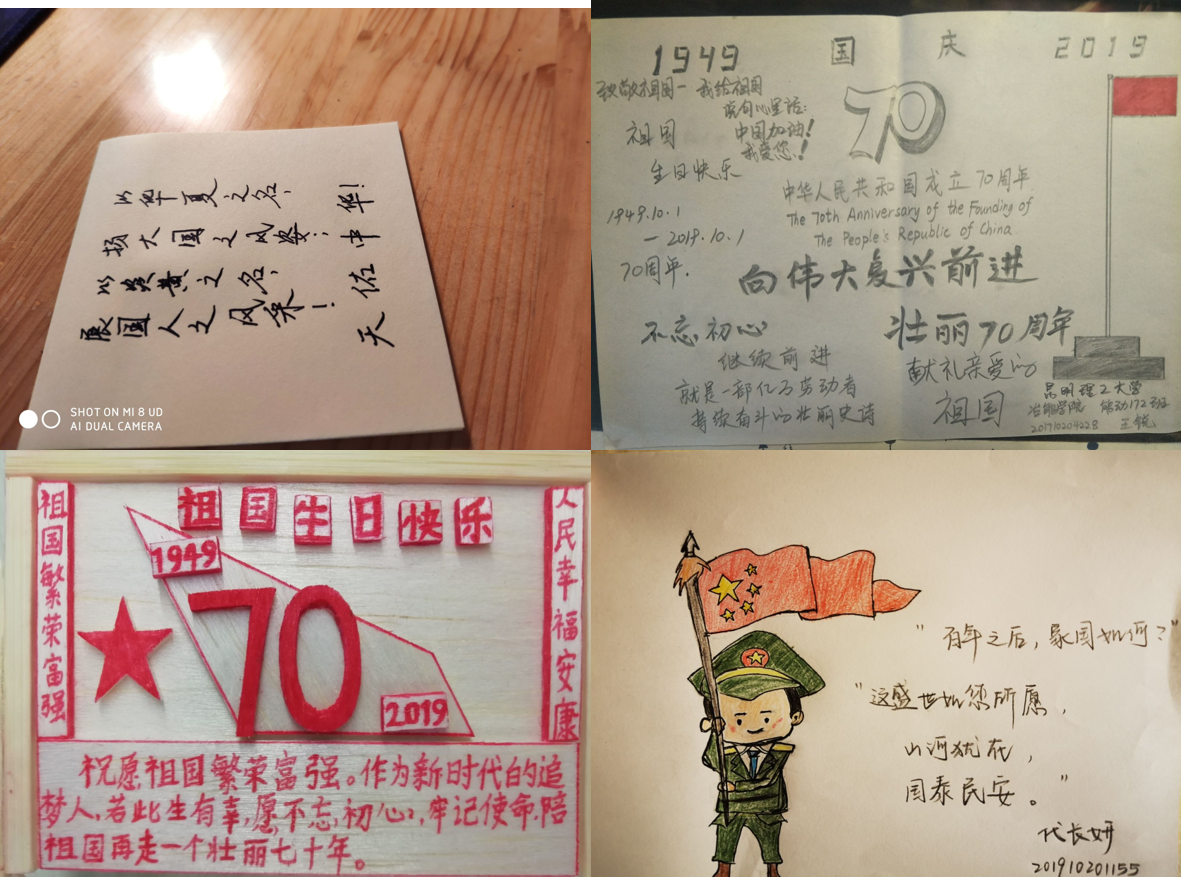 此次活动采取线上报名参赛的形式,通过班委在班群里进行宣传,加入活动群后,在规定时间内将作品上传到活动群中。此次活动的作品不限形式,书画、作品等成为了同学们表达对祖国母亲祝福的一种载体。同学们各显神通,有的为祖国写了一首振奋人心的诗;有的录制视频,将对祖国母亲的祝福亲口传达;更有甚者将祖国的美好山河汇聚于画笔下,以此表达自己对祖国的热爱。同学们热情高涨,创意十足,从中我们体会到了娱乐城平台
